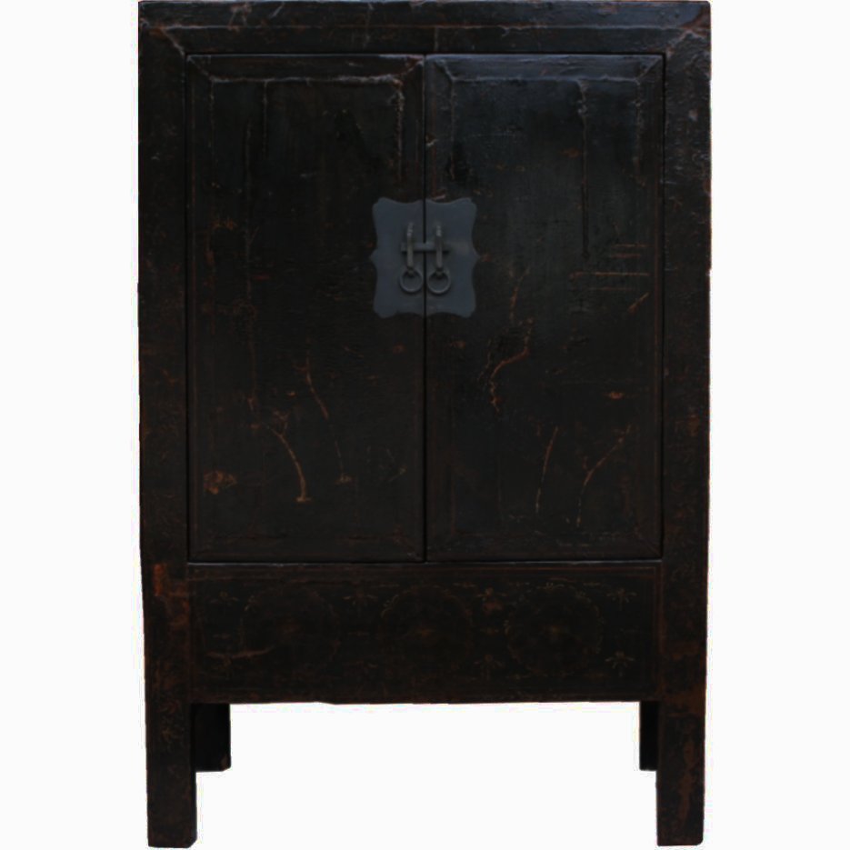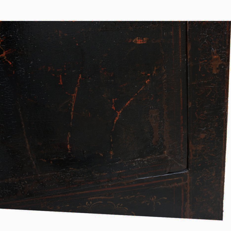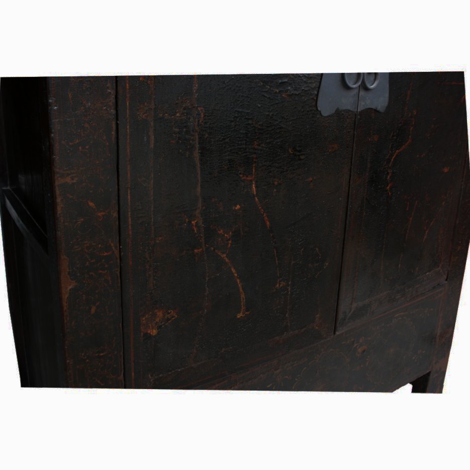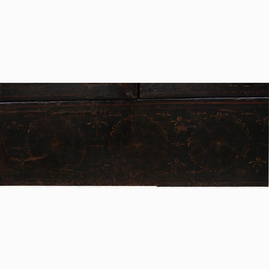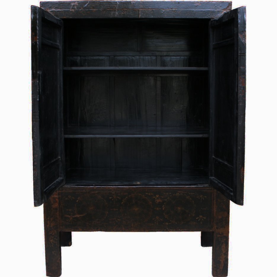 This antique Chinese old black cabinet is large and heavy. It is from Hebei Province of China. Over time some part of the black paint faded and wood grain could be seen. Gold Paintings of flower all over the frame of the cabinet. On the door panels, there are faded scenery but needed to look ver closely.