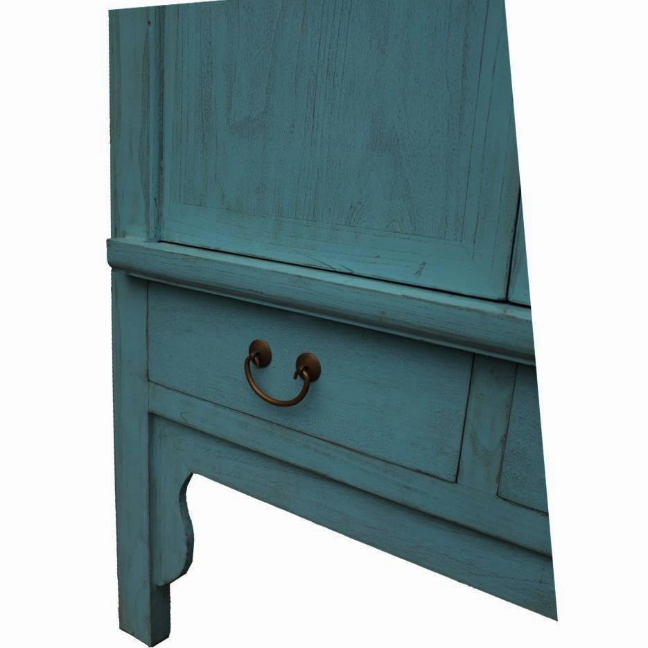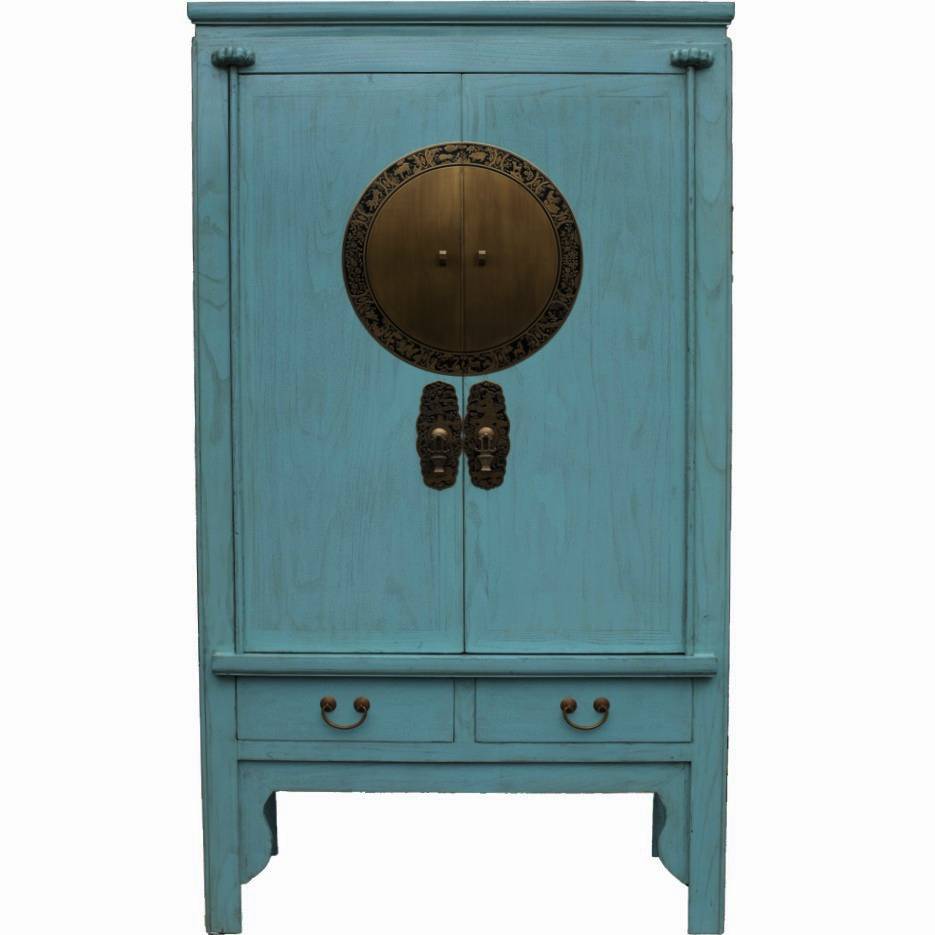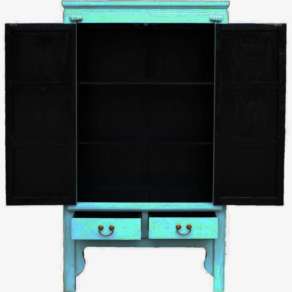 Blue Chinese lacquer wedding cabinet makes a sumptuous wardrobe, linen cupboard or TV cabinet. Housing removable shelves, a hanging rail and two drawers; enabling plentiful storage. This versatile Oriental tall cabinet is perfect dining room storage