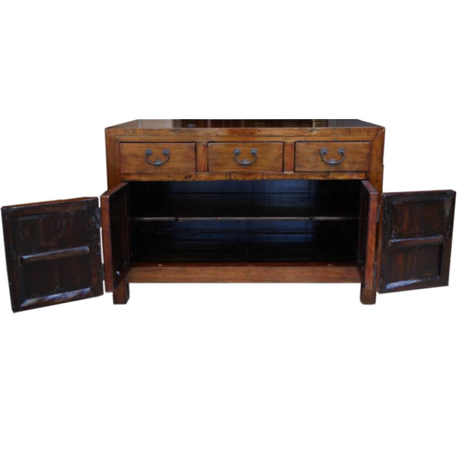 This is a very solid sideboard made of Walnut tree wood. With small amount of red patina still be seen over the whole sideboard, the dark walnut wood grain is beautiful. Three drawers on the top part of the sideboard and four door panels underneath the drawers. The door panels on both sides were joint with brass plates that they can be extended to the side of the cabinet. Big items can be easily put in. It will be a theme piece in any room.