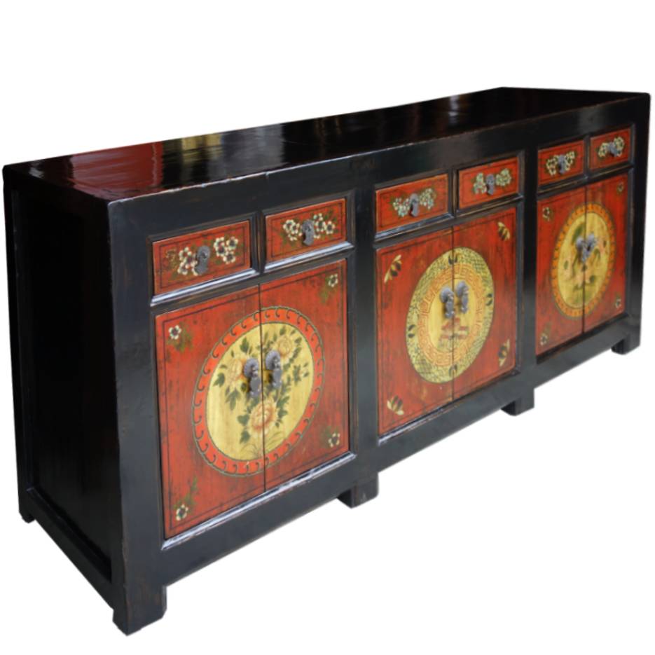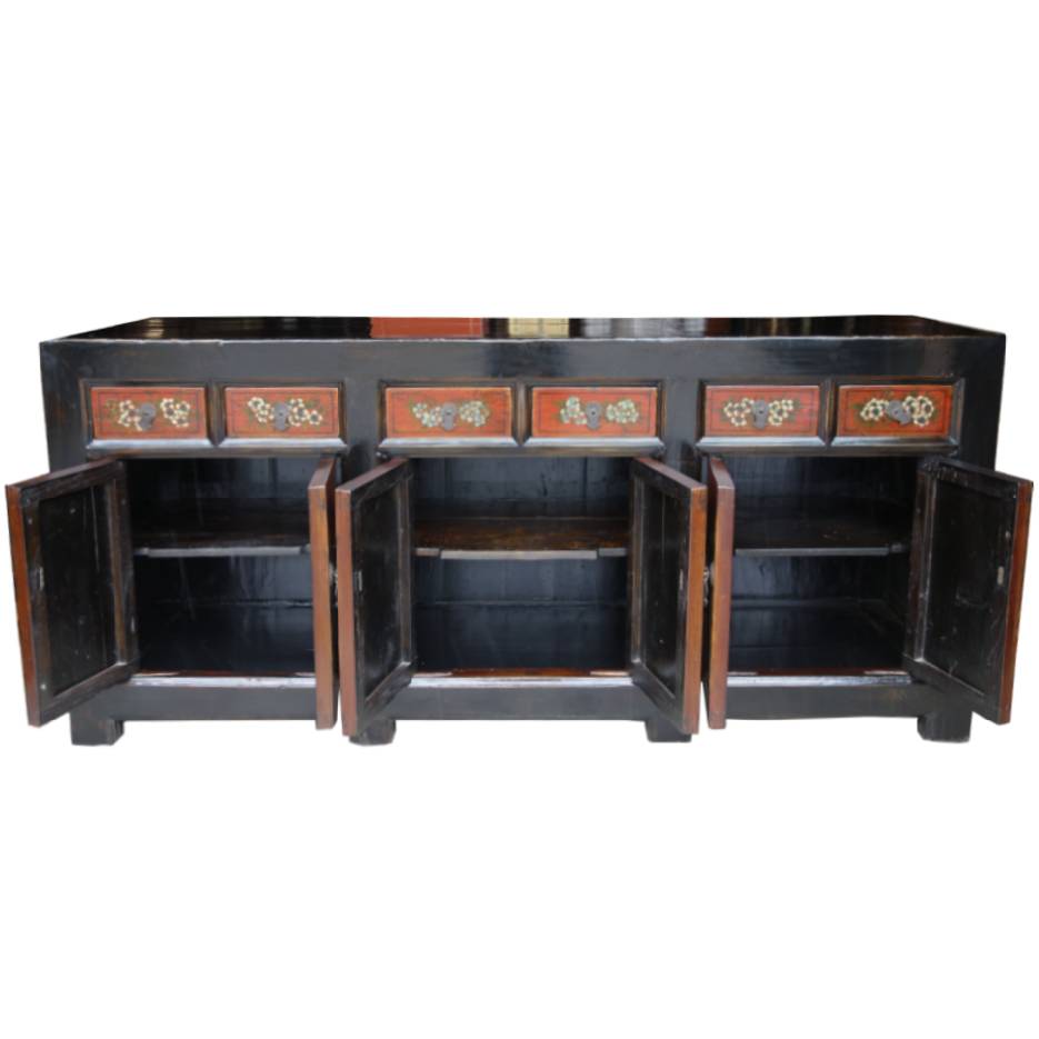 The buffet features three sets of double doors and six drawers to reveal two shelves with storage capacity. The front, the top and the sides were painted in black. The six door panels were painte with red and yellow tone with flora. It also covered in layers of thick lacquer to provide additional protection from wear with mortise and tenon joinery. Lots of character on the antique piece with a story to tell.