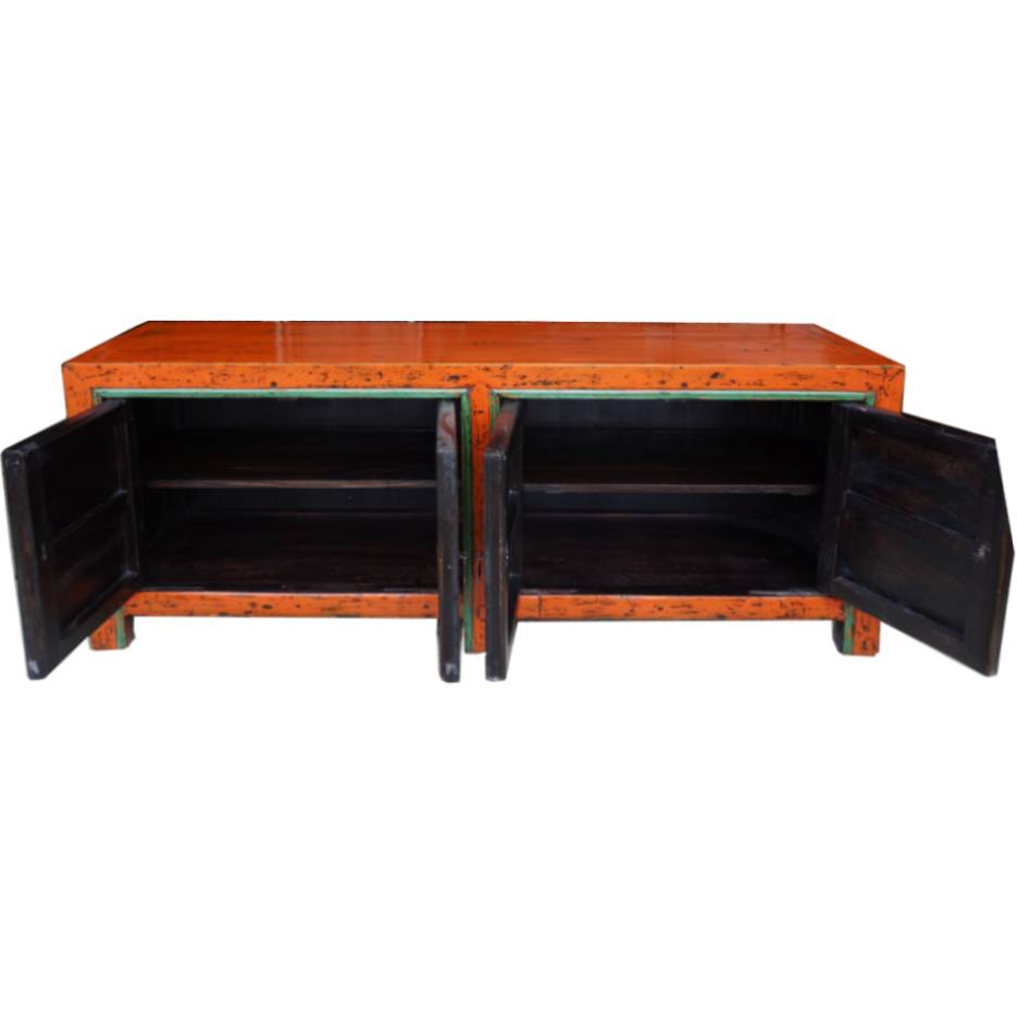 This 1970s Tibetan Low Sideboard with four doors featured its beautiful orange colour all over the whole cabinet with hand painted Flora and Tibetan Buddhist Symbols.