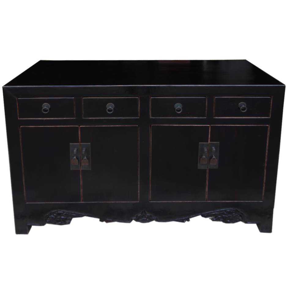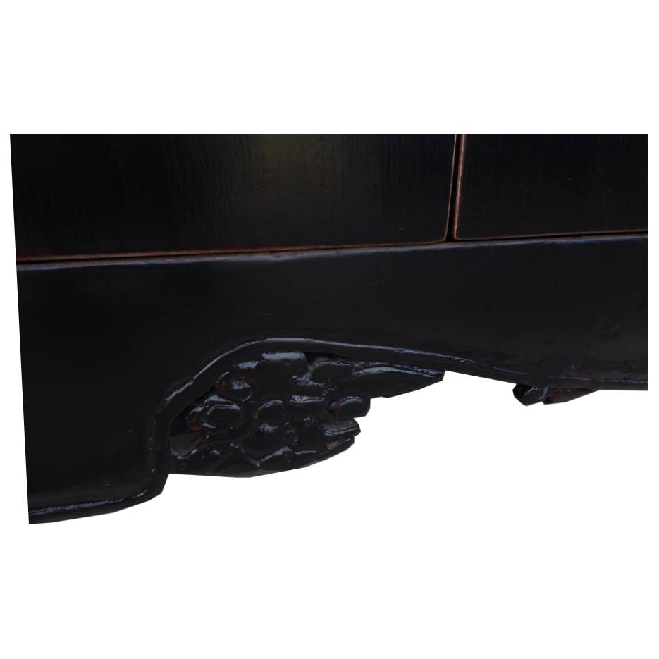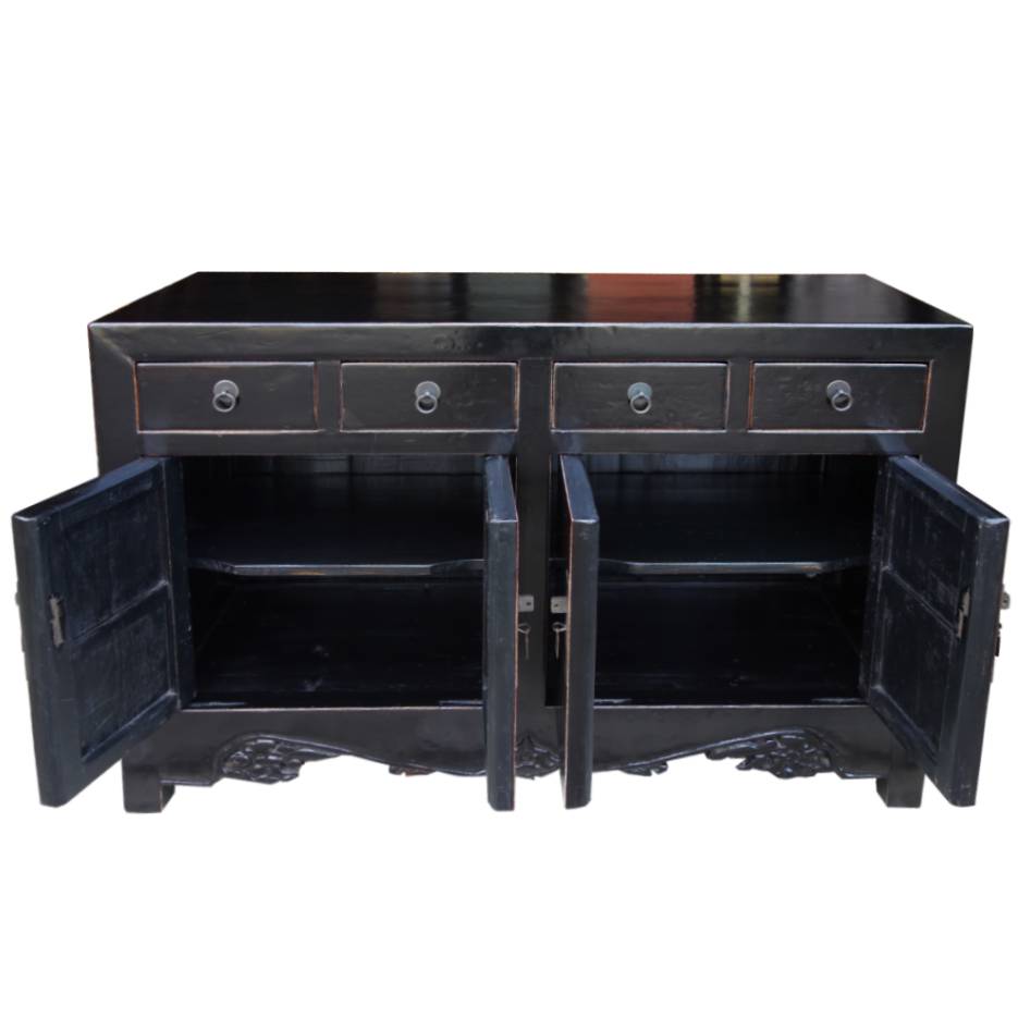 This Chinese Old Black Sideboard Buffet with Carvings featured its original old black patina as well as the carvings on the bottom of the front. It will be a great decorative piece in any room.