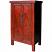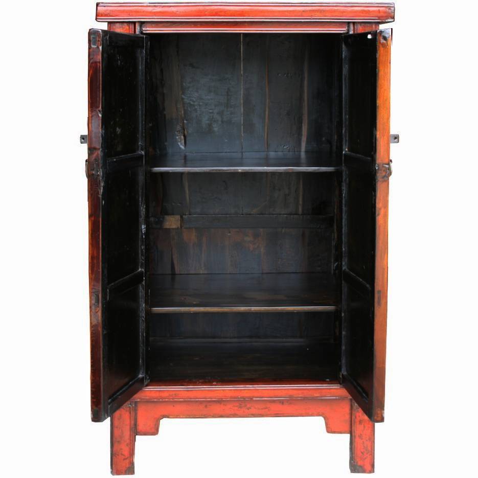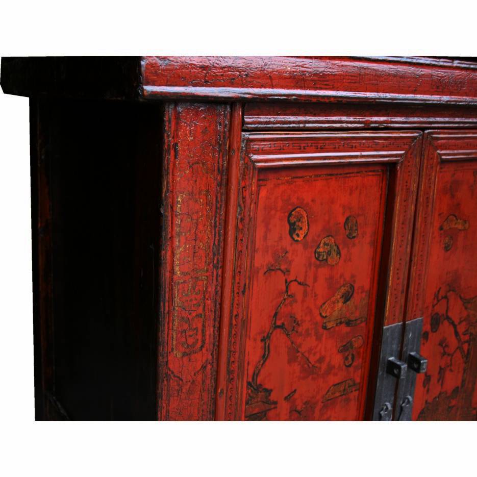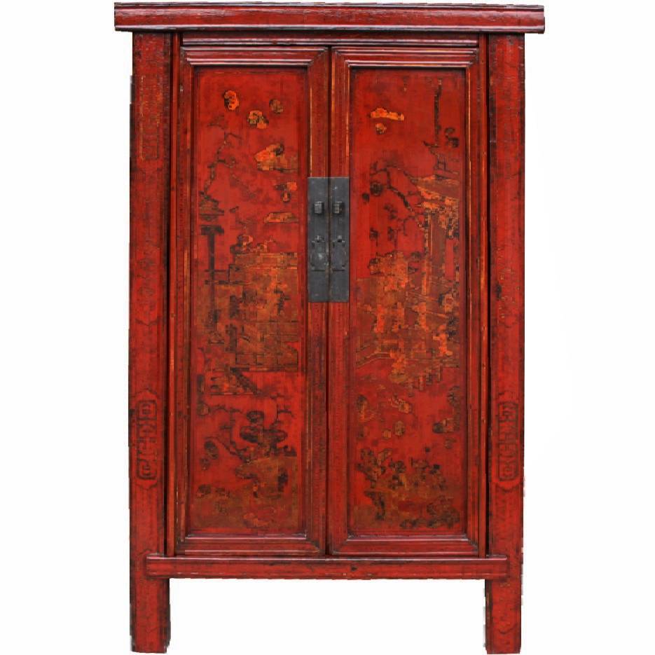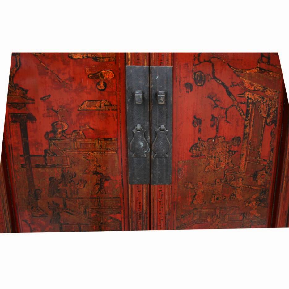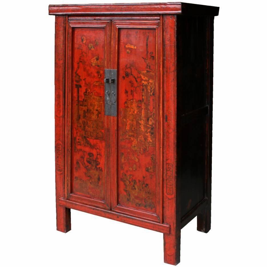 This antique Chinese Red Cabinet was a tapered cabinet with a thick piece of "hat". It featured the gold painting of Chinese Orient ancient house and people and it is very solid and elegant.