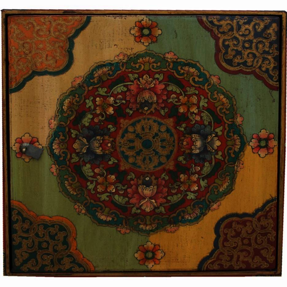 Tibetan cabinet also know as a Tibetan book chest. Used traditionally for scholar books. The hand painted floral and fauna design is typical of Tibetan art designs. This cabinet has eye catching colours combinations. The Flora Paintings on the two doors and the draw in the middle made it so attractive.